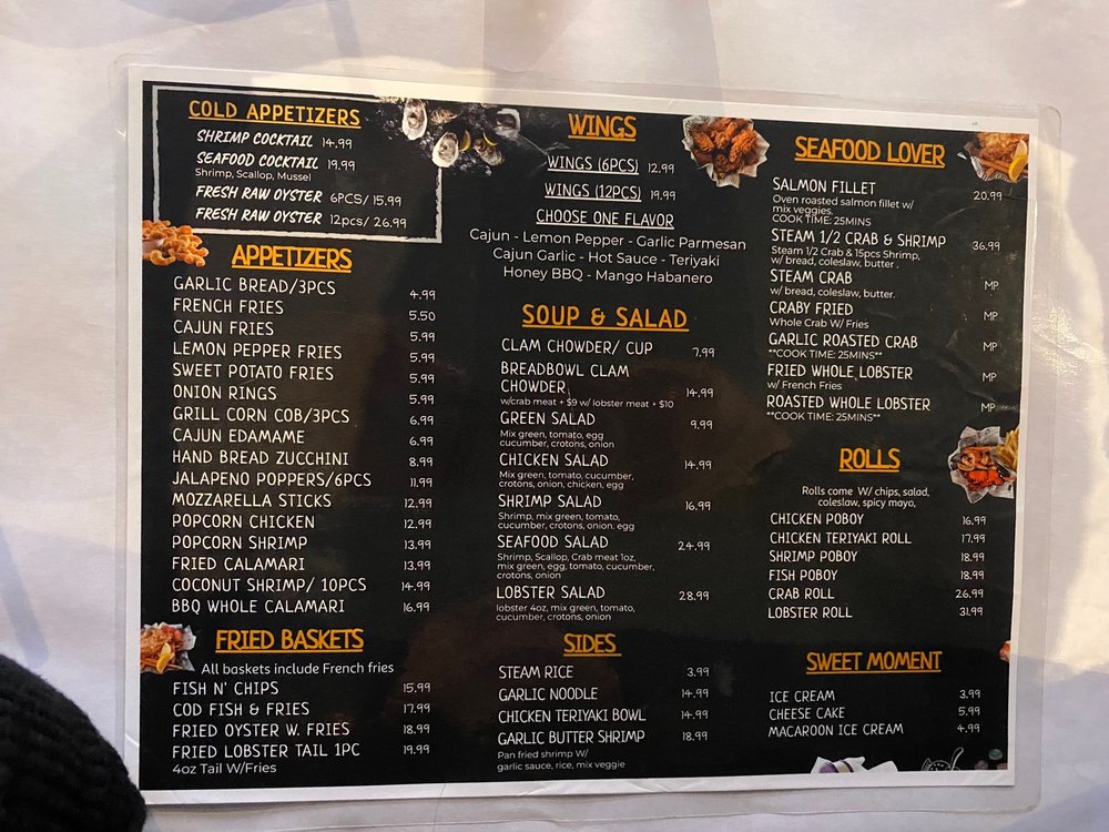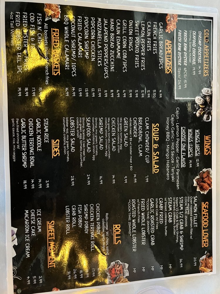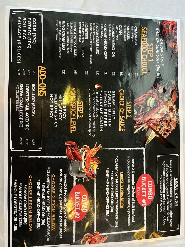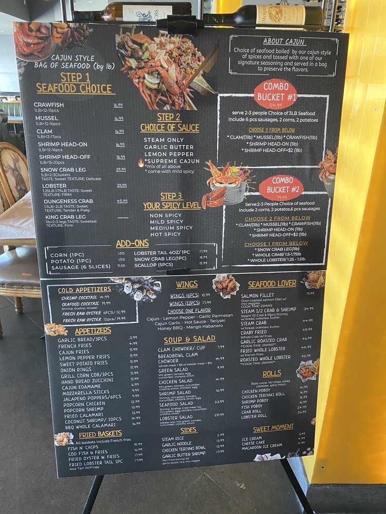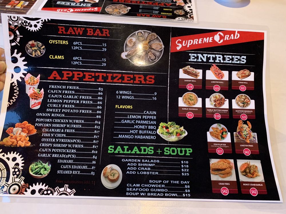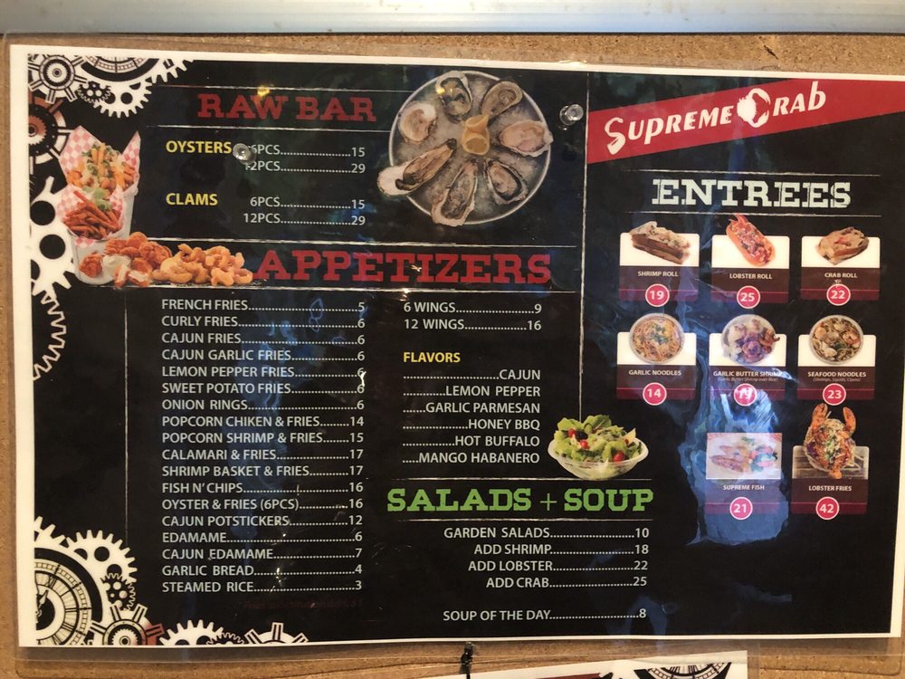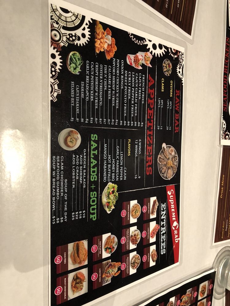 Introducing the menu at Supreme Crab, located in San Francisco, offers a diverse range of appetizers like Cajun Potstickers and Popcorn Shrimp with Fries. Their salads include options like Garden Salad with Lobster Meat and Garden Salads with Crab meat. Wings come in various flavors such as Cajun and Lemon Pepper. Customers rave about the all-you-can-eat seafood buffet featuring snow crab legs, shrimp, mussels, oysters, and more. The ambiance is described as divey and casual, perfect for smashing crab legs and enjoying a variety of seafood offerings. With views of the yacht and a price point of $32.99 per person, Supreme Crab provides a filling and fun dining experience, particularly for seafood lovers.